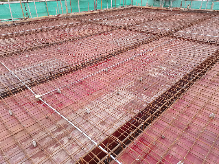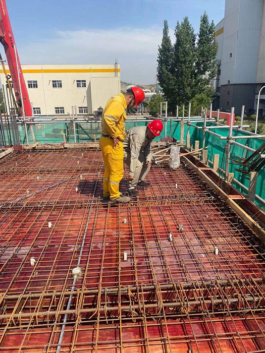 在尿素综合楼11米层施工平台上,钢筋师傅手中的扎丝钩子犹如手中针线在密密麻麻的钢筋中穿针引线,梁板柱在细细的丝绳中编织成了筋骨。在木工师傅在一锤一钉的奏乐下为钢筋制作好了笔直平整的外壳,犹如待出嫁的姑娘穿上了嫁衣,管线的预埋穿插进行,现场项目管理人员拿着图纸进行检查核对、指导监督。安全、质量、进度项项抓,样样不放松。在大家紧张有序的协同工作下,完成了尿素综合楼主体结构的钢筋绑扎、模板支护、管线预埋工作。各项检查验收符合设计要求及规范标准,达到混凝土浇筑条件。