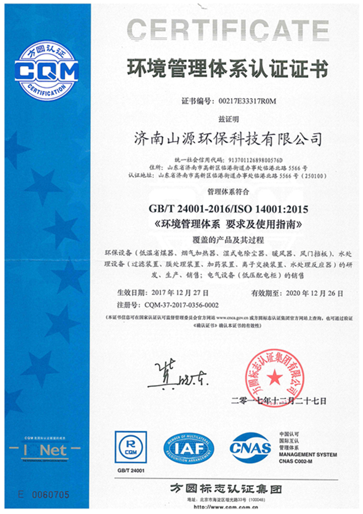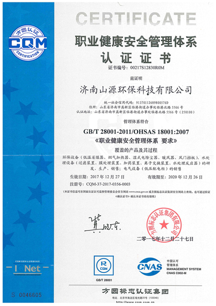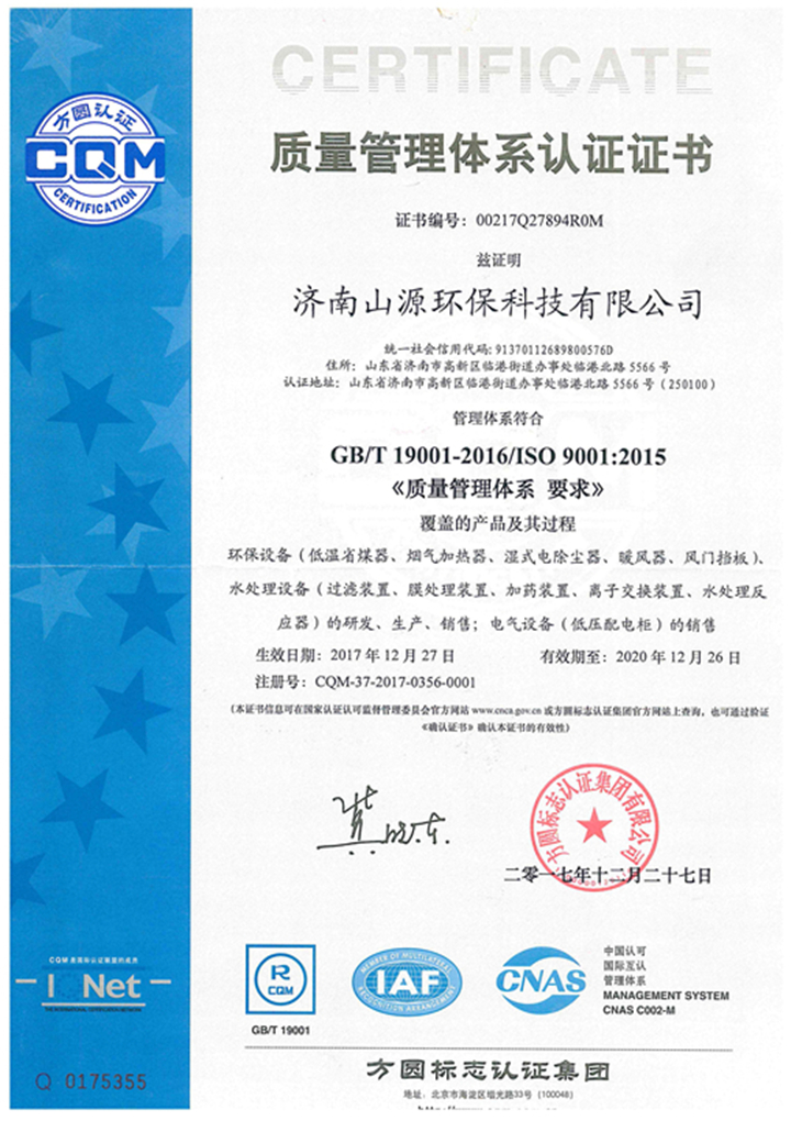 济南山源环保科技有限公司顺利通过ISO9001质量体系认证,环境体系认证,职业健康体系认证等。取得国家多项烟气余热、水处理、废水零排等技术研发专利。凭借专业的技术团队、强大的制造规模、丰富的工程实战经验,公司先后被评为高新技术企业、“守合同重信用企业”、“环境保护产业协会理事单位”,荣获节能先进企业”、环保行业“突出贡献企业”等荣誉称号。公司设有专业技术研发中心,并被认定为济南市市级“技术中心”,先后与中科院工程热物理研究所、西安交通大学、上海交通大学、东北电力大学、山东大学等高校合作,共同研究开发国内外节能减排新技术、新装备,并积极与多家国际公司技术合作不断引进国外先进技术和设备。